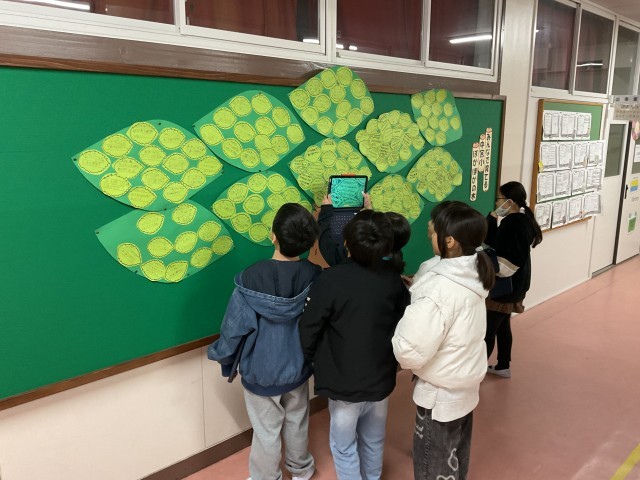 12月8日から図書室前の壁と2階渡り廊下に「ぽかぽかの木」が掲示されています。