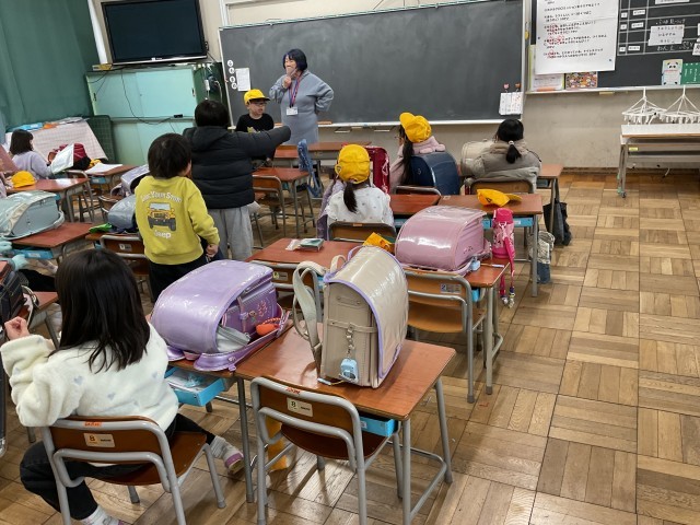 1年生が授業の後に帰りの準備をスムーズに行っています。