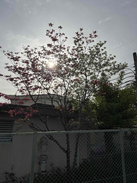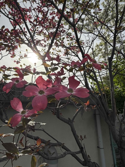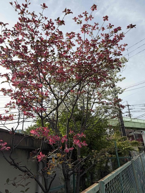 中宮小学校では、赤と白のハナミズキが咲いています。