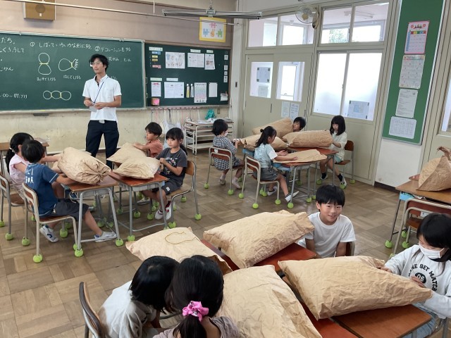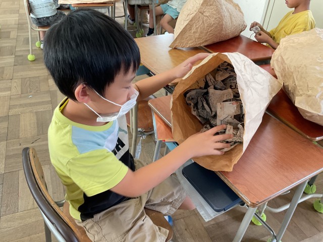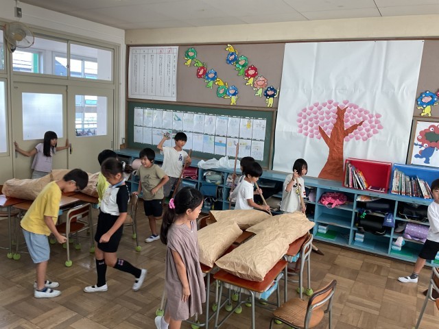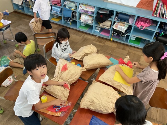 2年生の図工では何を作っているのでしょうか?大きな紙袋に新聞紙を詰めて、あさひもで縛ります。子ども達の頭の中には完成した形がはっきり見えているようです。題名にお友だちとあるので、動物や昆虫を作っているのかな?完成したら確認したいと思います。