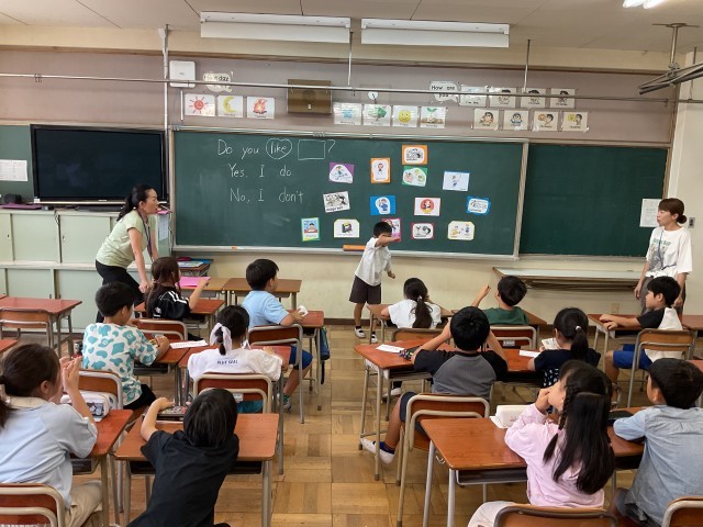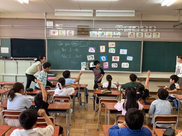 3年生の外国語活動では、「Do you like〜?」の学習です。友達のジェスチャーを見て、好きかをたずねます。