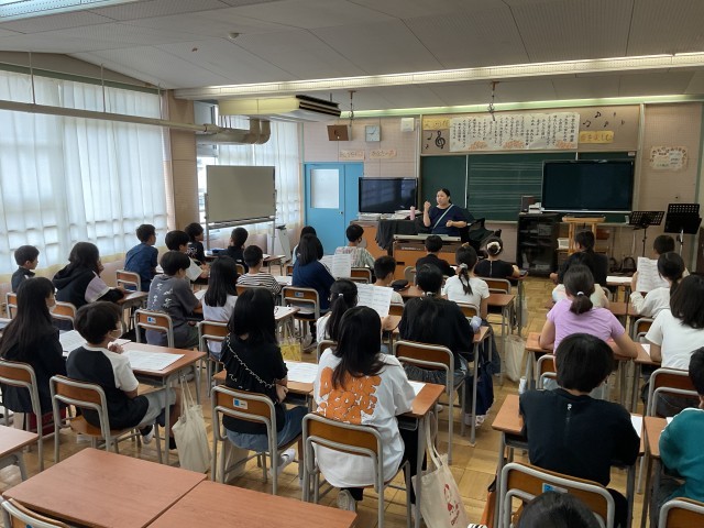 6年生の音楽では、修学旅行の時に合唱する曲の練習をしていました。先生からこれまで学習したことや、戦争、平和についてどう表現するかを問われ、まだまだ表情がかたい様子でした。平和ポスターで素晴らしい表現をすることができた6年生達なので、合唱がどのような表現になるか気になるところです。