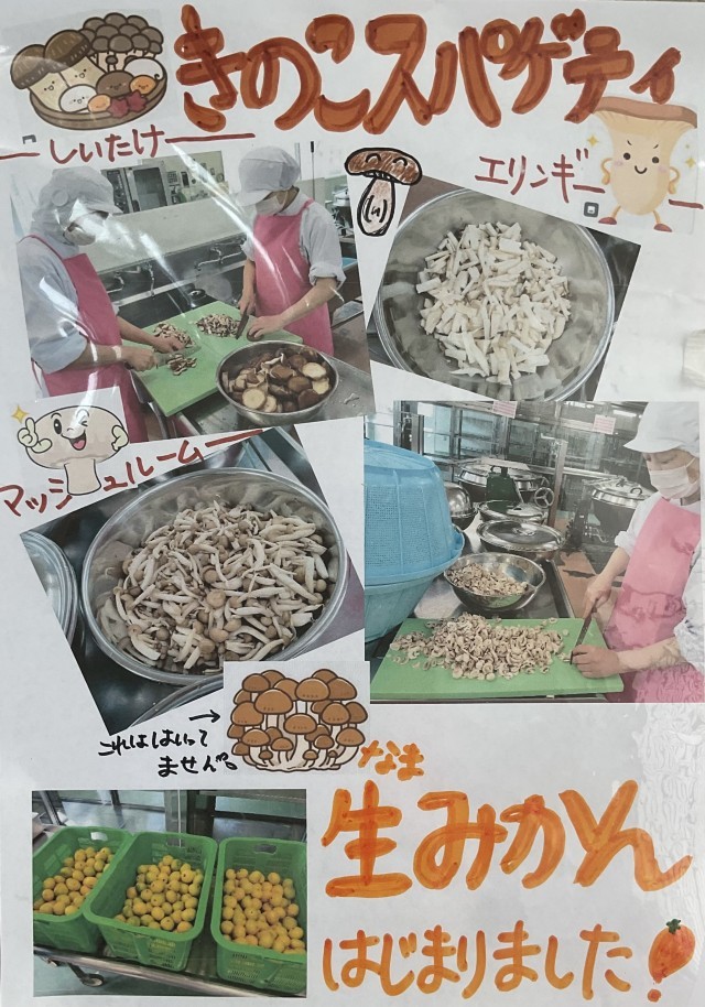 今日の給食はきのこスパゲティです。また、生みかんも今日からスタートということで、秋を感じるメニューでした。【献立】きのこスパゲティ、みかん、ささみとキャベツのソテー、コッペパン、牛乳