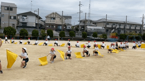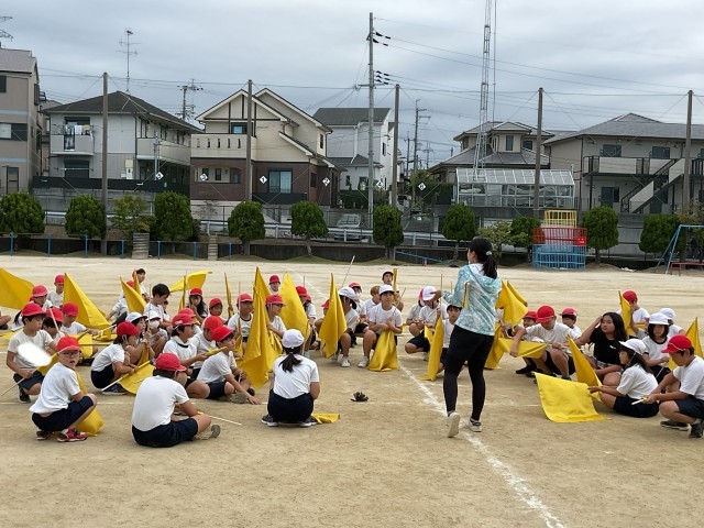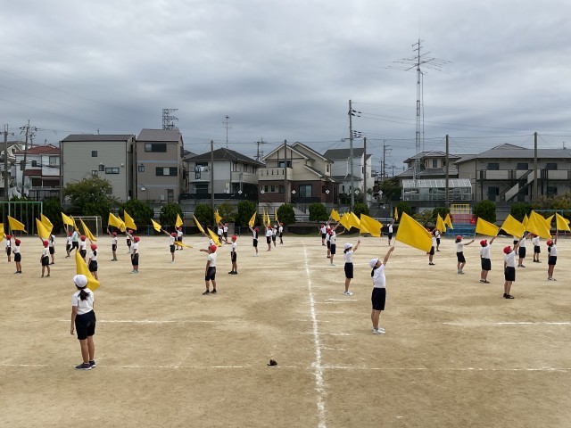 今日は風が強かったので、「風に流される!」と声が出ていましたが、フラッグで風を切る音が格好良かったです。フラッグを力強く振る姿がとても勇ましい5年生でした。