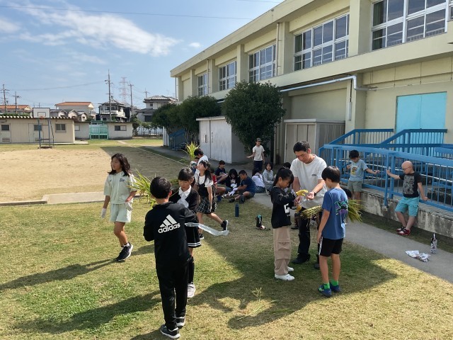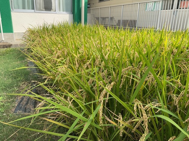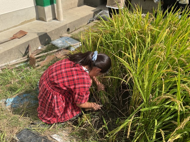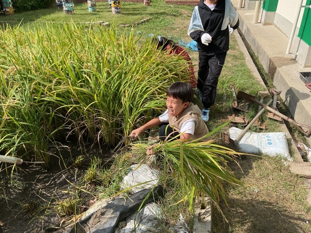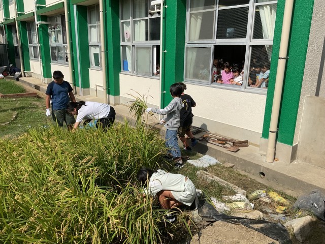 5年生が6月に植えた種籾が大きく育ち、穂が垂れ落ちるようになりました。本日、待ちに待った稲刈りをしました。2人ずつ順番に鎌を持って、刈りにいきます。しっかり根の方を掴み、下の方から鎌を入れていきます。刈り取った稲は、友達と協力して紐で縛っていきます。ここまで手際良くでき、収穫した稲を積んでいくと、学校の片隅で育てた稲でも、予想以上の量が収穫されていることに驚きました。田んぼが1年生教室外ということもあり、途中から1年生に応援されながら、米を収穫していく5年生でした。