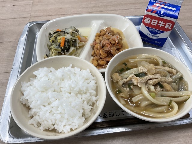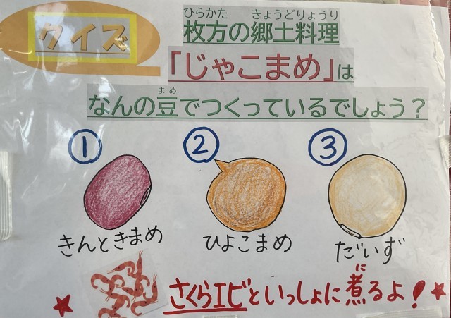 今日の給食はじゃこまめです。じゃこまめは、北河内地域の郷土料理で、川えびをとる時に小魚がとれて、それらを一緒に煮ていたそうです。給食では桜えびが使われています。えびの風味がほのかに感じ、とても美味しかったです。【献立】じゃこまめ、きつねうどん、白菜のポン酢風味、ご飯、牛乳