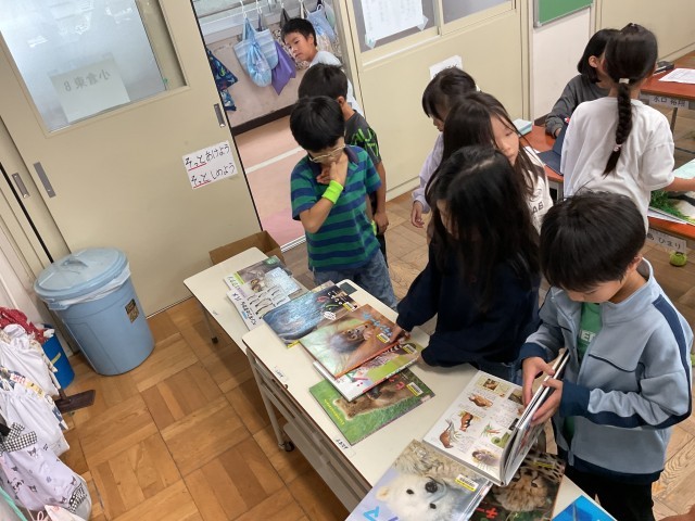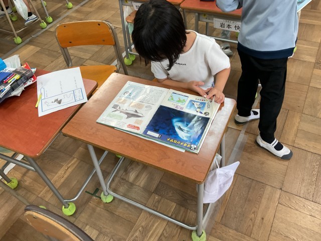 2年生は国語の学習でどうぶつカードを作ります。みんなが知ってないような、とっておきのどうぶつのひみつを調べてカードにします。学校司書さんに選んでもらった本から自分の選んだ動物を調べます。カードはタブレット端末かプリントで仕上げます。タブレット端末でも絵を上手に仕上げる様子を見て、低学年でもICT活用ができていると感心しました。