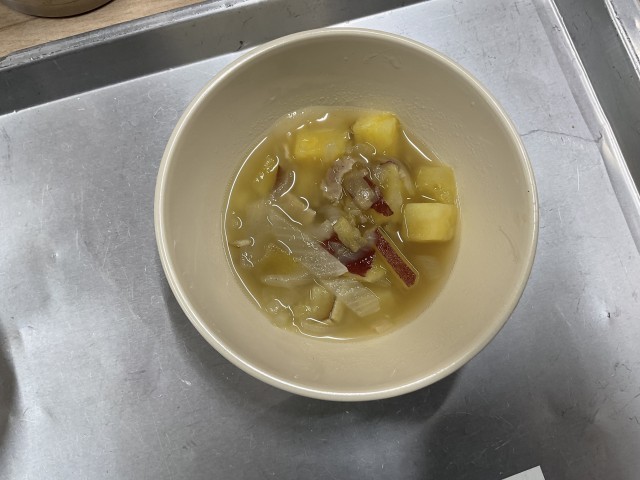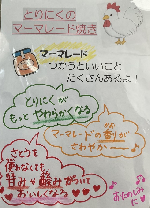 今日の給食は鶏肉のママレード焼きです。ママレードは鶏肉を柔らかくする作用があり、また砂糖を使わなくても甘味や酸味がついているので、爽やかで美味しかったです。【献立】鶏肉のママレード焼き、さつまいもクリームスープ、キャベツのソテー、コッペパン、牛乳