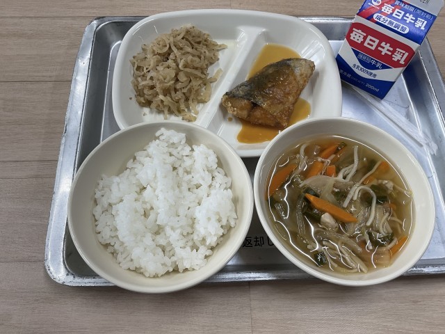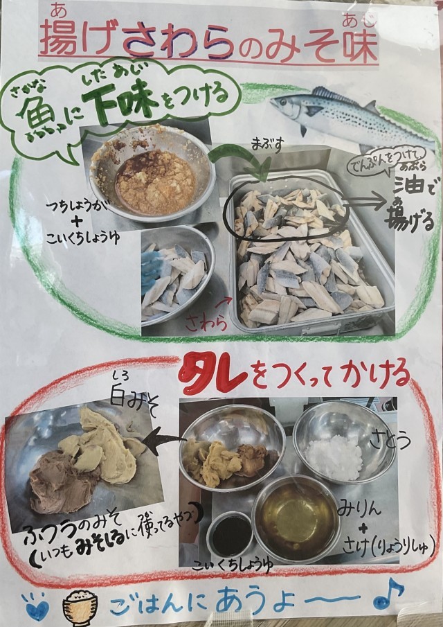 今日の給食は揚げさわらの味噌味です。タレは写真にありますように、沢山の調味料が使われ美味しいのですが、さわらにも濃口醤油とつち生姜で下味をつけているのでさらに美味しくなっているのですね。【献立】揚げさわらの味噌味、玉ねぎのお汁、いためたくあん、ご飯、牛乳