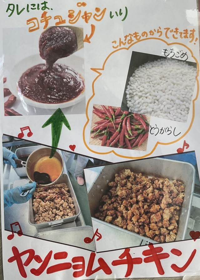 今日の給食はヤンニョムチキンです。ヤンニョムチキンにはコチュジャンが使われており、コチュジャンには唐辛子が入っているので、辛い味がするんですね。辛い味がご飯を進めてくれます。【献立】ヤンニョムチキン、人参のナムル、春雨スープ、ご飯、牛乳
