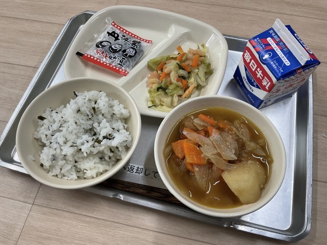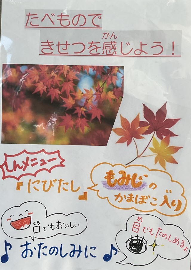 今日の給食は煮びたしです。紅葉型のかまぼこが新メニューとなります。季節感があってとても美味しかったです。【献立】煮びたし、そぼろに、わかめごはん、かりかり黒豆、牛乳
