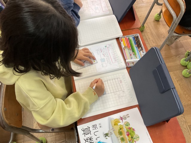 その後1Lますをノートに書き、10等分して1より小さい数を色鉛筆で塗りました。ここで等分という言葉を確認し、10等分したうちのいくつぬったかを確かめることで、1より小さい数の概念を深めました。
