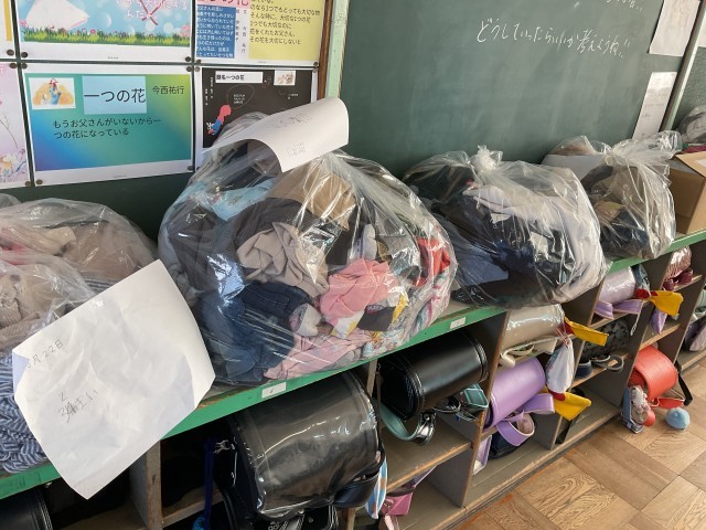 4年生は、小倉ジュニアパビリオンで取り組んでいた古着回収について、経過報告をしました。現在回収した古着は約300着とのことです。