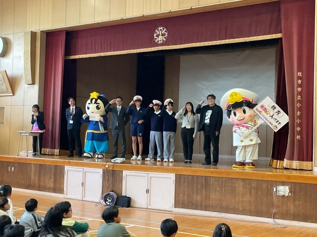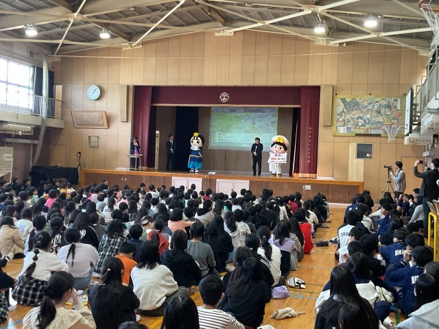 KONAMIからはプロデューサーである岡村憲明様をはじめ、PR部門の戸部様、高野様をお迎えし、また枚方市の広報プロモーション課もお招きし、今の小倉小学校の全児童と当時の6年生である中学生も参加して「桃太郎電鉄2」の枚方駅追加の報告会を開催しました。