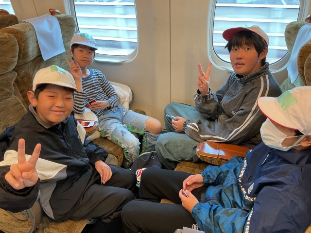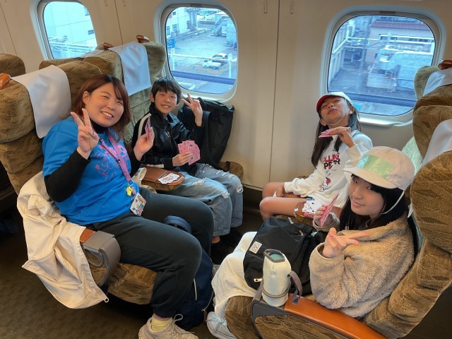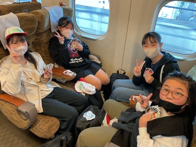 駅を出発すると、席を向かい合わせにしてトランプをするなどして、リラックスタイムです。移動中も楽しく過ごせることが、修学旅行の醍醐味ですね。