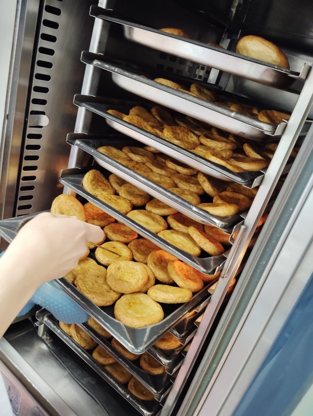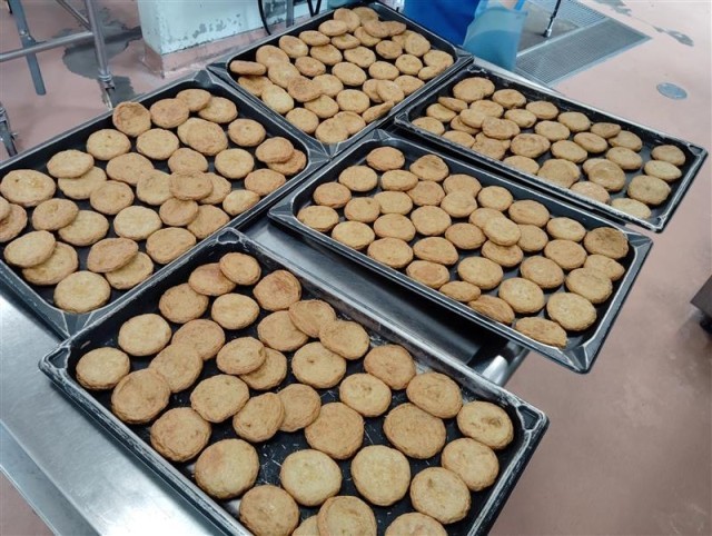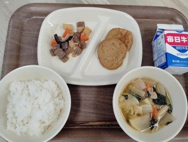 今日の給食はじゃこてんです。じゃこ天は小魚の骨までおいしく食べられる料理です。調理場で作られてる様子です。調理場で一枚一枚温めてもらっています。【献立】じゃこてん、筑前煮、冬野菜鍋、ご飯、牛乳、ご飯