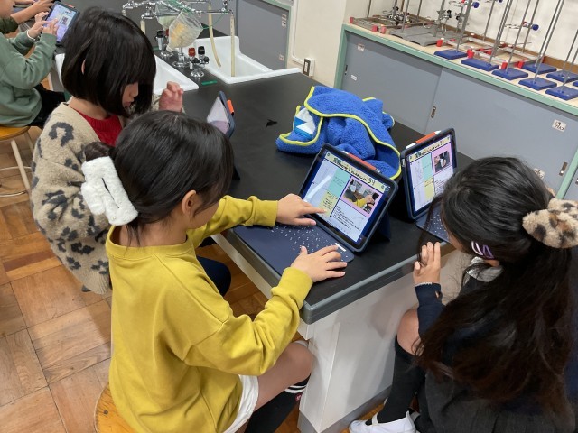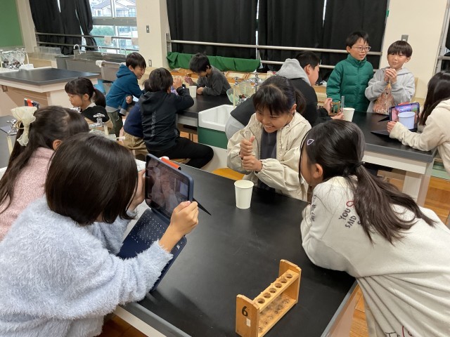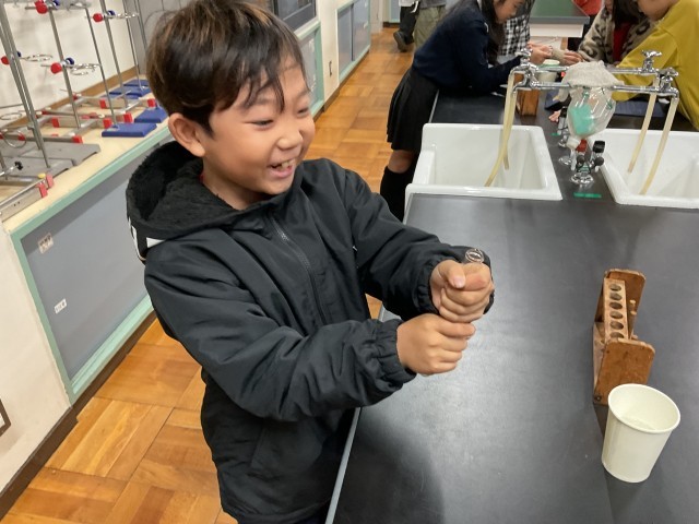 「どうしたら膨らむかな?」と皆で考えていると、手で握っていた試験管の口からふっくらシャボン液が膨らんだようです。そのことに気がつきた班は、一生懸命試験管を握って、試験管を温めていました。