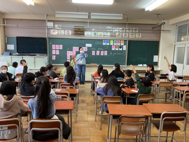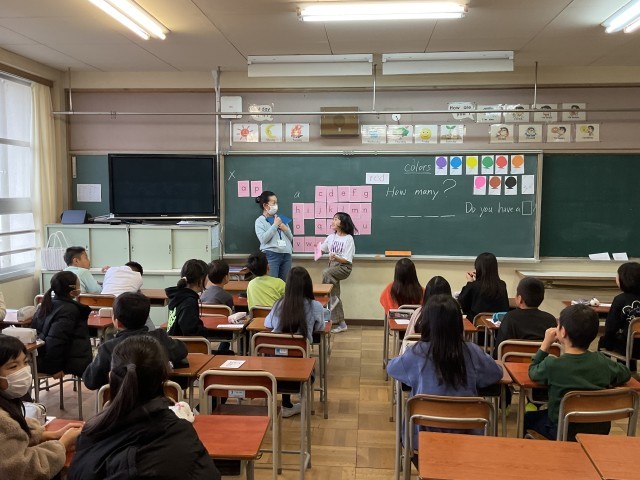教室をのぞくと、4年生が外国語活動の学習に取り組んでいました。