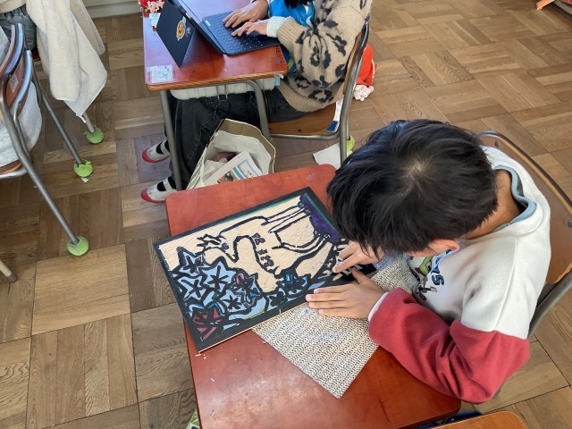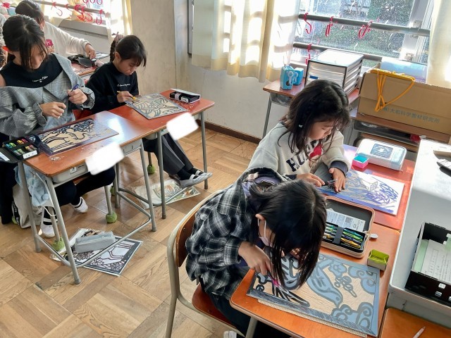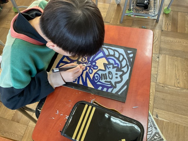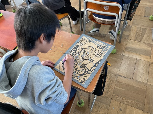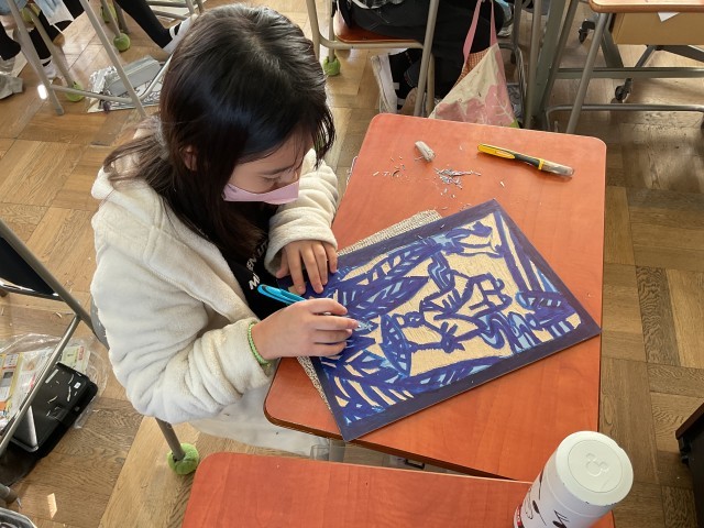 4年生は今年購入した彫刻刀を使って、彩色版画に取り組んでいます。