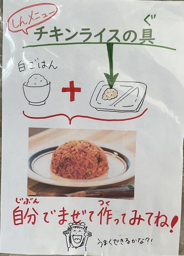 今日の給食はチキンライス(の具)です。調理場でチキンライスを作ることができないので、チキンライスの具を自分でご飯に混ぜます。児童の皆さん、上手に混ぜることができましたか?【献立】チキンライスの具、ポテまめサラダ、ノンエッグマヨネーズ、ジュリエンヌスープ