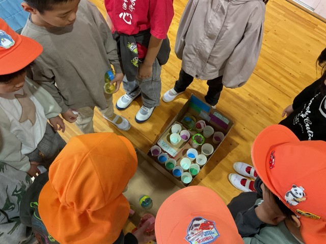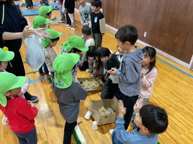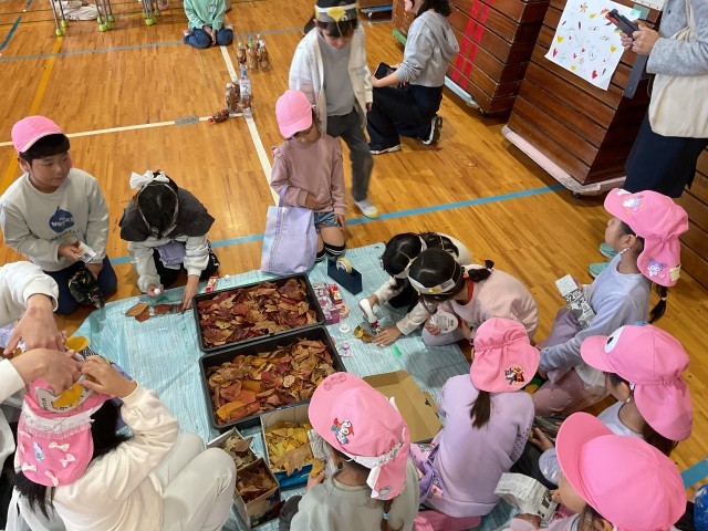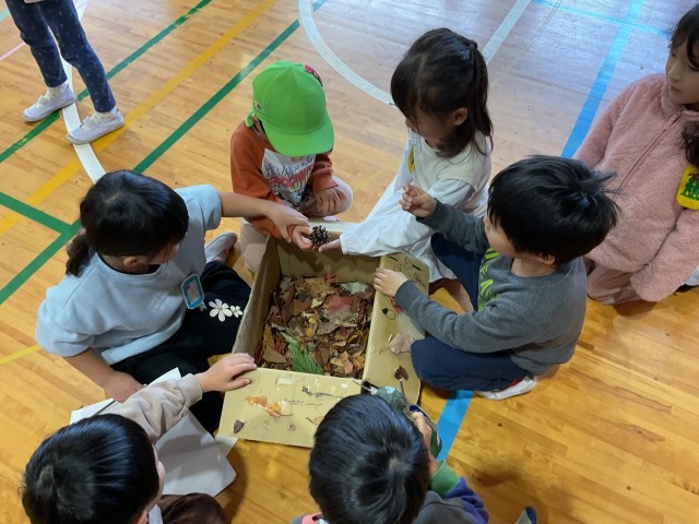小倉保育所の幼児が楽しく遊べるように、自分達で出し物を考えました。出し物は生活科で学習した秋探しで見つけたドングリや落ち葉を使って、作ります。