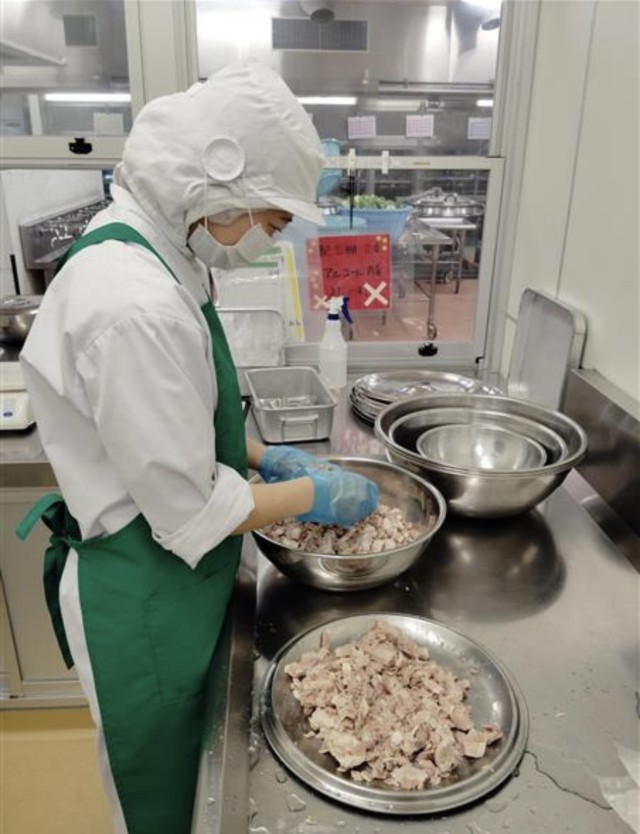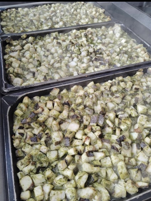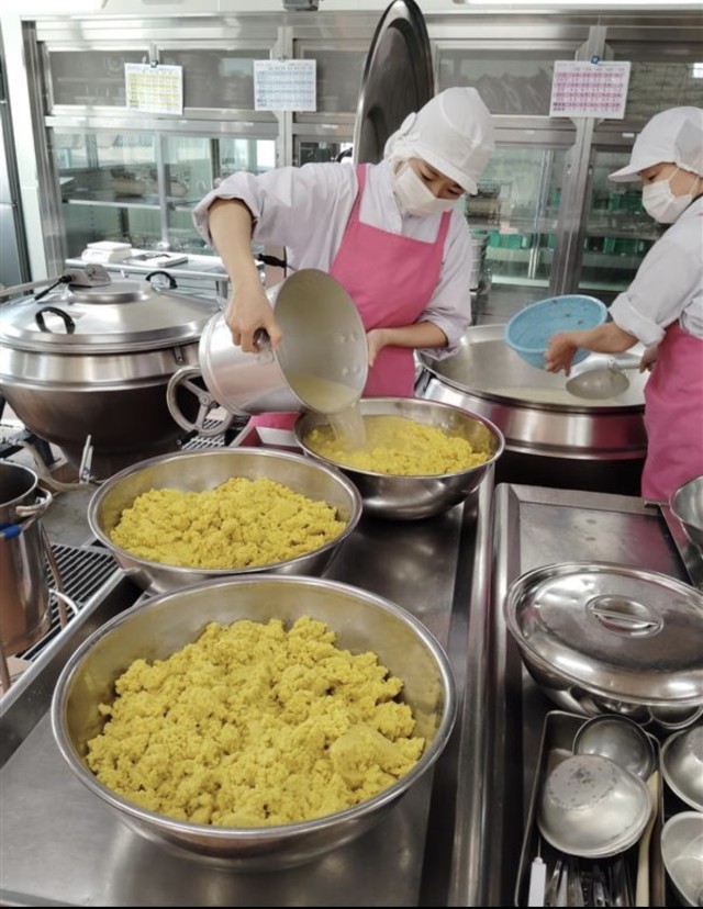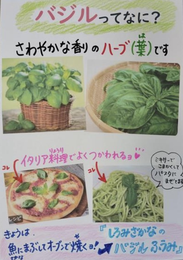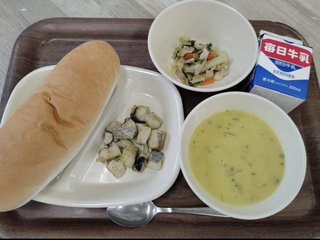 今日の給食は白身魚のバジル風味です。さわやかな香りのハーブが使われていて、魚の味を引き立ててくれています。【献立】白身魚のバジル風味、青梗菜の炒め物、とうもろこしスープ、コッペパン、牛乳