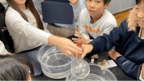 水の実験は丸底フラスコに水を入れてガラス管を刺すだけですが、空気の実験の時はガラス棒にゼリーを入れて変化を見るため、何もしなくてもゼリーが落ちてくるなど苦労していました。