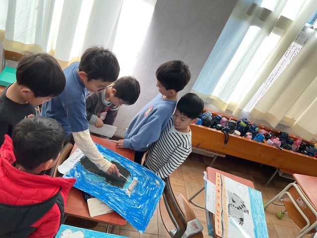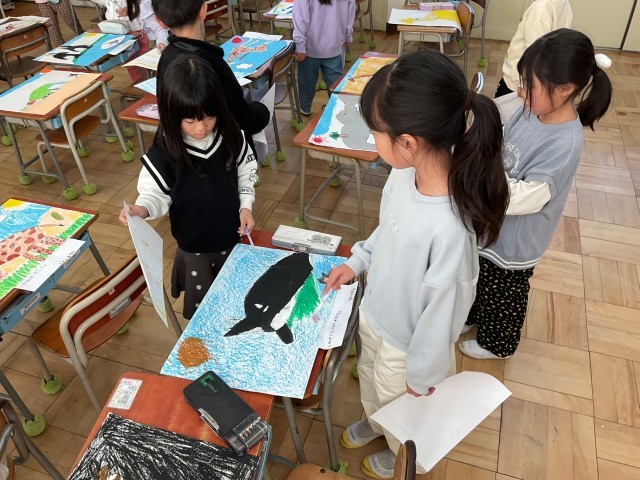 その後、机の上に置かれた友達の絵を鑑賞しますが、作品に対して質問している子達がいたので、感心しました。