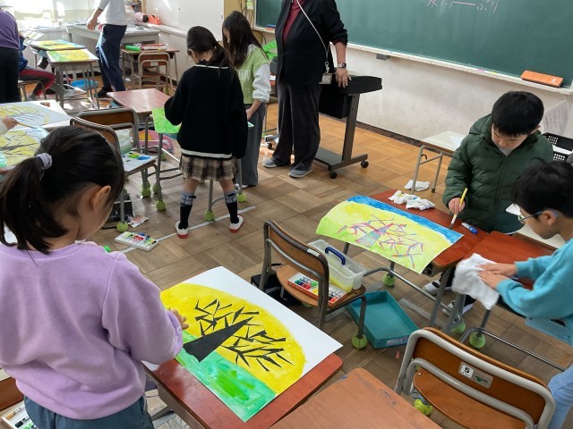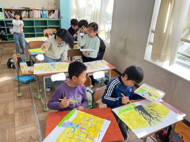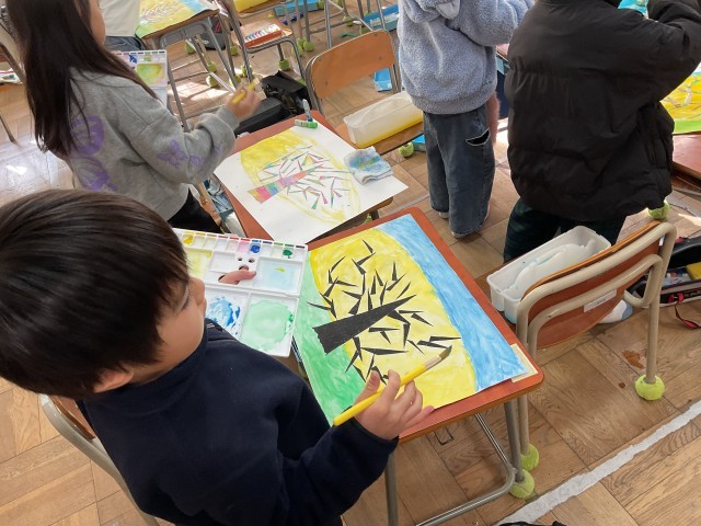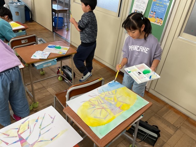 その後、背景に色をつけていきます。初めに貼った木も塗ってしまう為、水を多めの色をつけます。絵の具につける水の量がポイントになる為、2年生はパレットの色作りに気をつけていました。