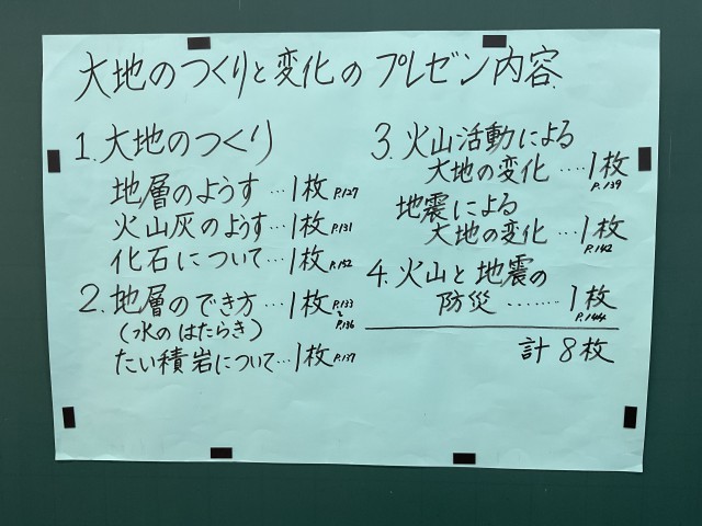 この単元では自由進度学習を取り入れ、自分が学習した内容をプレゼンで発表するため、プレゼン資料にまとめます。今回のプレゼン資料のノルマは8枚以上。