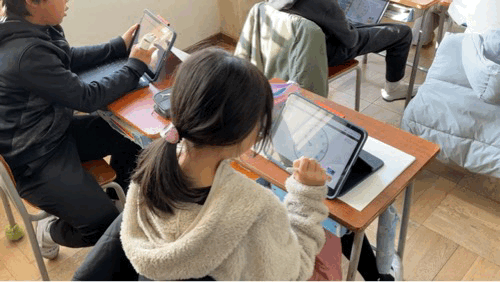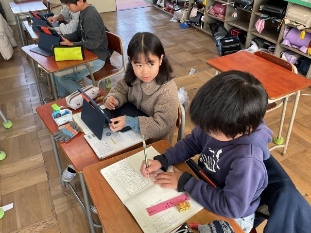 デジタル教科書の時計ばん使って、変わり方の謎について考えます。表と裏をひっくり返して、友達と考えますが正解には辿り着けません。先生から表にまとみてはと促されると、何か閃いた様子。記録をすることの大切さを身にしみた4年生でした。