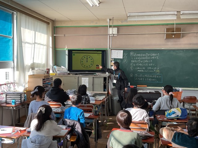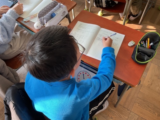 4年生の算数は「変わり方に注目して調べよう」という単元の導入で、表と裏がそれぞれ違う時刻の時計ばんを使って変わり方の学習をしていました。