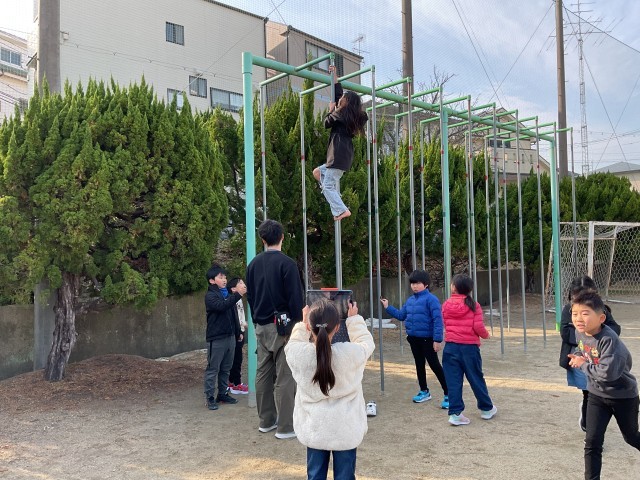 子どもの好奇心はすごいもので、高鉄棒のてっぺんはくっつくかなと寒い中裸足になって登っている子もいました。