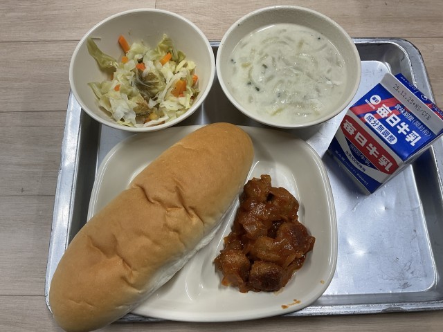 今日の給食はいんげん豆のクリームスープです。白いいんげん豆をペースト状にしてとろみが増し、豆を意識することなく食べることができるので豆が苦手な子も美味しく食べることができます。【献立】いんげん豆のクリームスープ、肉ボール、ラハノサラタ、コッペパン、牛乳