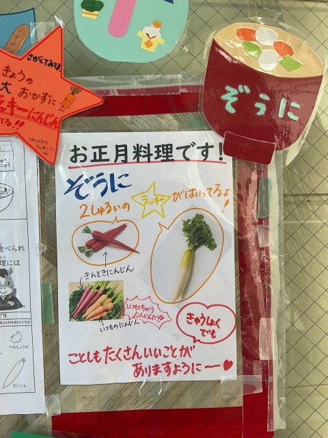 今日から給食が開始です。嬉しい!献立は雑煮、ぶりの照り焼き、黒豆、ご飯、牛乳です。嬉しいことに雑煮の中には、ラッキー人参だけではなく、ラッキー大根も入っていました。
