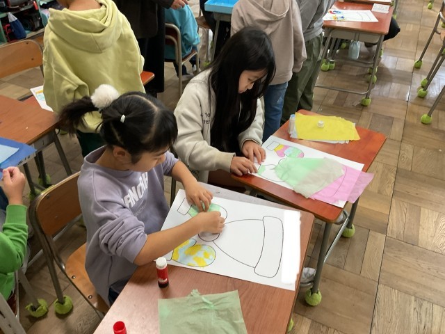 おしゃれなアイテムのなるように色合いを考え、お花紙をちぎって一つずつ重ねていきます。
