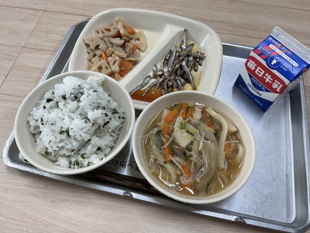 今日の給食はあんかけうどんです。煮汁にでんぷんでとろみをつけてあんにするそうです。今日の寒い日に体が温まる料理です。【献立】あんかけうどん、たづくり、レンコンの甘酢あえ、わかめご飯、牛乳