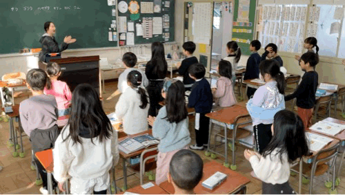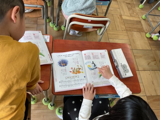 四季の様子が1番ごとに書かられていて、どんな特徴がある確認します。「こりすがちょろり」という動作の歌詞では、机から少し顔を出す表現をしている子が何人もいました。