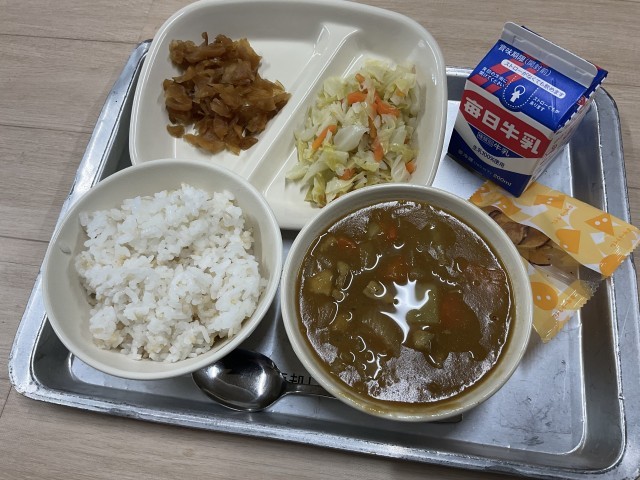 今日の給食はチキンカレーと玄米ご飯です。大人気のチキンカレーに入れるご飯は、玄米ご飯です。玄米は稲から籾殻だけを取り除き、精白されていない米で、白米より栄養素がたくさん含まれています。プチプチした食感がとても美味しいです。【献立】チキンカレー、玄米ご飯、ラハノサラタ、福神漬け、さつまいもチップス、牛乳