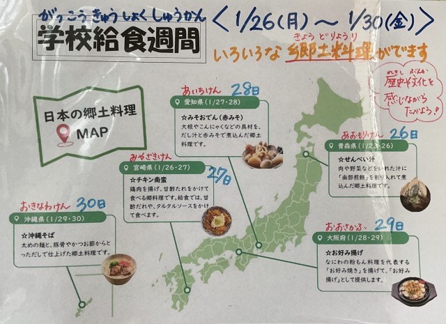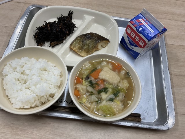 今日の給食はせんべい汁です。今日から「都道府県ごとの郷土料理を味わおう」といった給食週間が始まります。今日は青森県の郷土料理「せんべい汁」です。特徴は南部せんべいを割り入れて煮込んである所です。せんべいが麩のように柔らかく、味が染み込んで美味しかったです。【献立】せんべい汁、ほっけ、ひじきの炒め、ご飯、牛乳