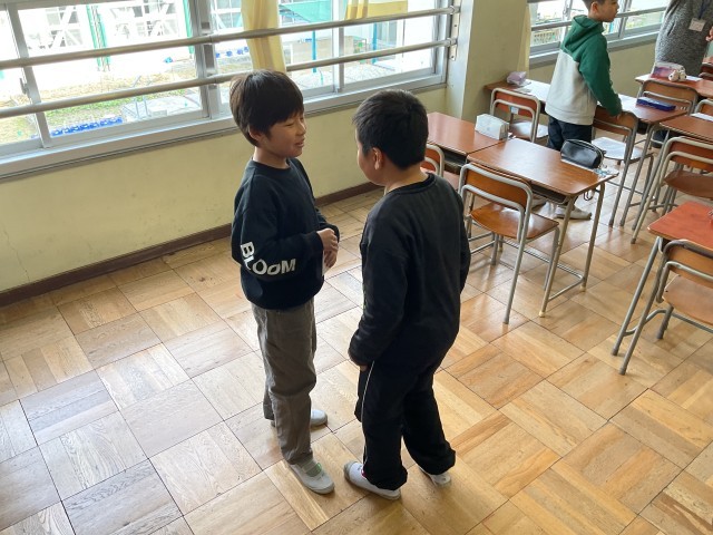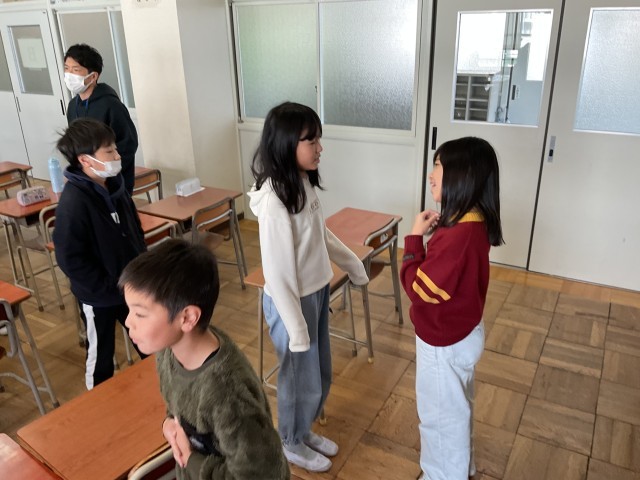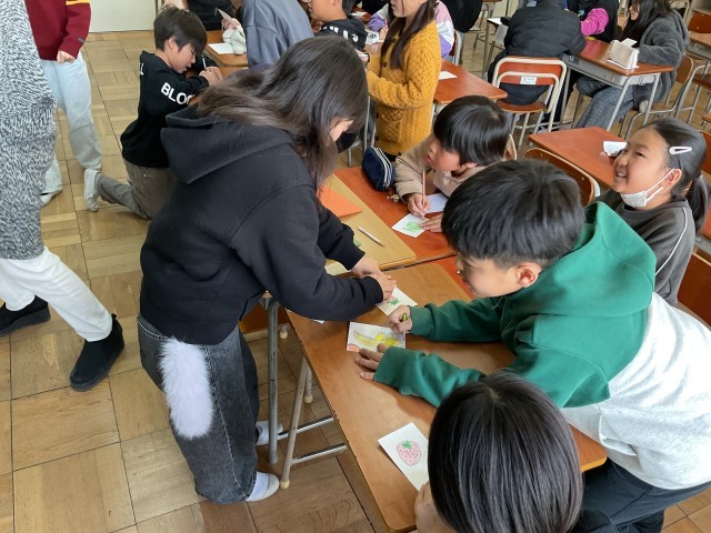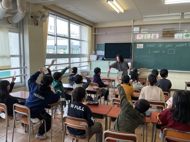4年生の外国語活動では、カードに果物や野菜の絵を描き、そのカードを誰が持っているか探すゲームをしていました。