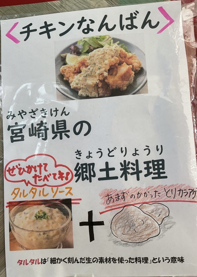 今日の給食は、宮崎県の郷土料理「チキン南蛮」です。ノンエッグタルタルソースも付いていて、美味しく頂きました。【献立】チキン南蛮、ノンエッグタルタルソース、タイピーエン、キャベチと胡麻のやみつきサラダ、コッペパン、牛乳