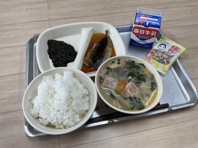 今日の給食は粕汁です。今日もよく冷えるので、粕汁を食べて体が温まりました。また今日は節分の日の為、鬼のかまぼこと炒り大豆が出ました。思わず豆まきがしたなりました。【献立】粕汁、年越しのいわし、海苔の佃煮、炒り大豆、ご飯、牛乳
