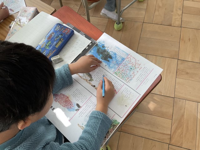 今日は先生からスイミーの音読を聞き、登場人物の整理をしました。