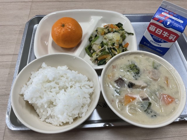 今日の大おかずは、さだ東小学校のお友達が考えてくれました。旬の野菜や魚などを使っていろとりどりにしたところと、味付けを和風にしたところがポイントだそうです。コクのあるシチューでとても美味しかったです。【献立】さむい冬もへっちゃら!心も体もあったまる和風シチュー・白菜のいためもの・ポンカン・ご飯・牛乳
