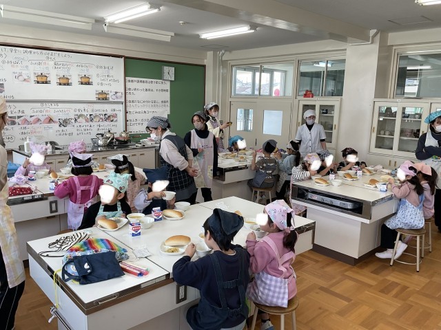 その後、家庭科室で給食を食べました。牛乳パックにストローをさすことに戸惑っていましたが、とても美味しそうに食べていました。園児の皆さん、小学生になったら毎日、おいしい給食が食べれ増すので楽しみにして下さい!