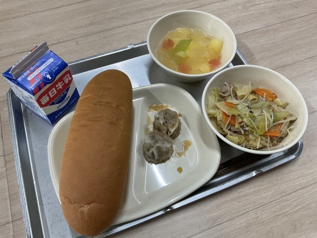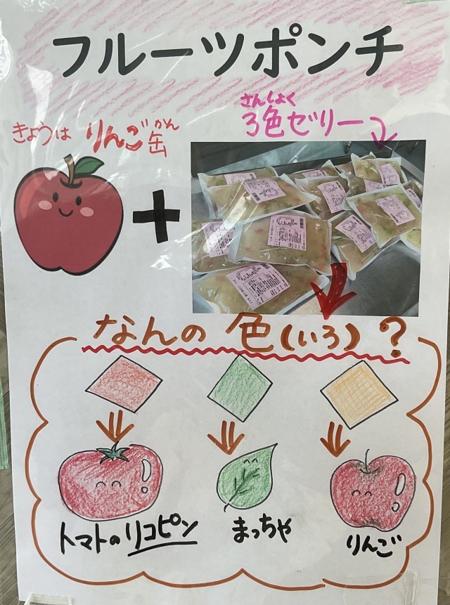 今日の給食はフルーツポンチです。今日のフルーツポンチはりんご缶に、トマトのリコピン、抹茶、りんごの3色ゼリーが入っていました。デザートがあって子ども達も大喜びでした。【献立】フルーツポンチ、野菜炒め、シューマイ、コッペパン、牛乳