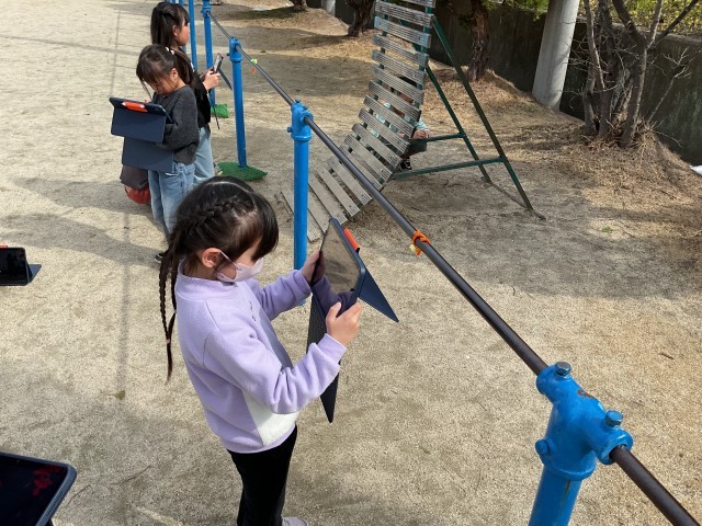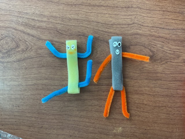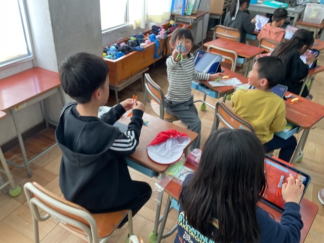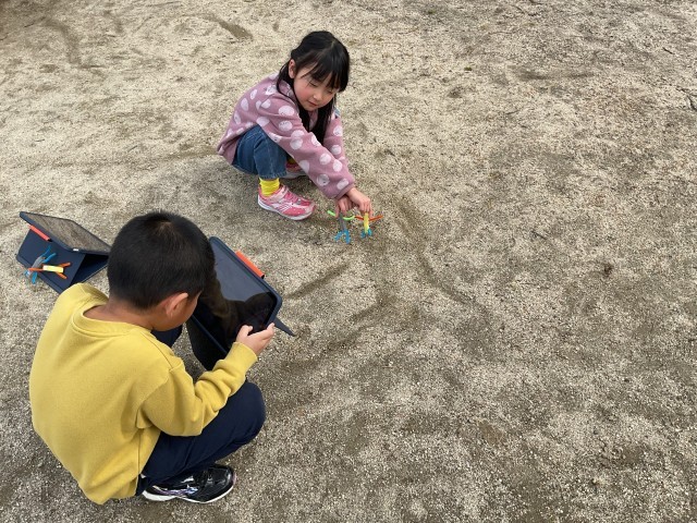 モールを切ってすきまちゃんを作り、好きなポーズを取らせます。また、すきまちゃんの物語を4コマ写真で作るので、今日は運動場や教室で写真を撮りました。