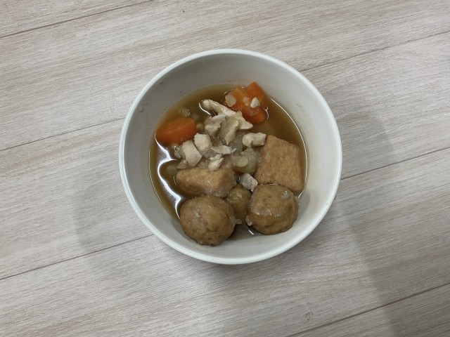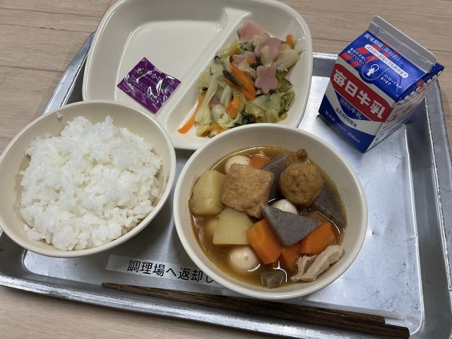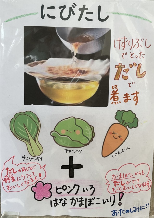 今日の給食はにびたしです。けずりぶしで取った出汁が野菜に染みていて美味しかったです。また、ピンク色の花かまぼこが入っているのも嬉しいですね。【献立】にびたし、関東煮、ゆかりふりかけ、牛乳、ご飯