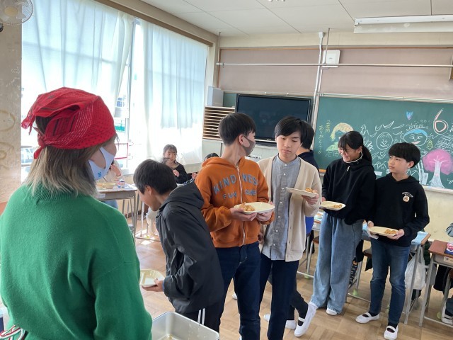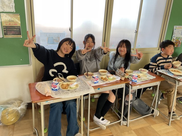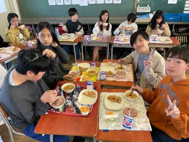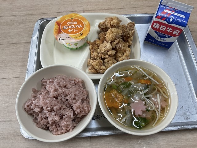 今日の給食はお祝い給食メニューです。祝い事で食べられる赤飯や、子ども達が大好き鶏肉の唐揚げがいつもより多く食べらたことに6年生はとても喜んでいました。6年生にとって最後の給食で、2クラスとも皆の顔が見れるように輪になって食べていました。【献立】赤飯、鶏肉の唐揚げ、ごま塩、お祝い汁、みかんゼリー、牛乳